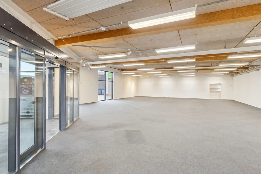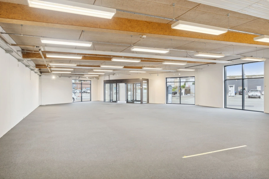 Lejemålet entreres via dobbelt skydedør, med gitter i vindfang, og leder ind til stort butikslokale, med en god grundbelysning og et godt, naturligt lysindfald fra de store vinduespartier ud mod parkeringspladsen.