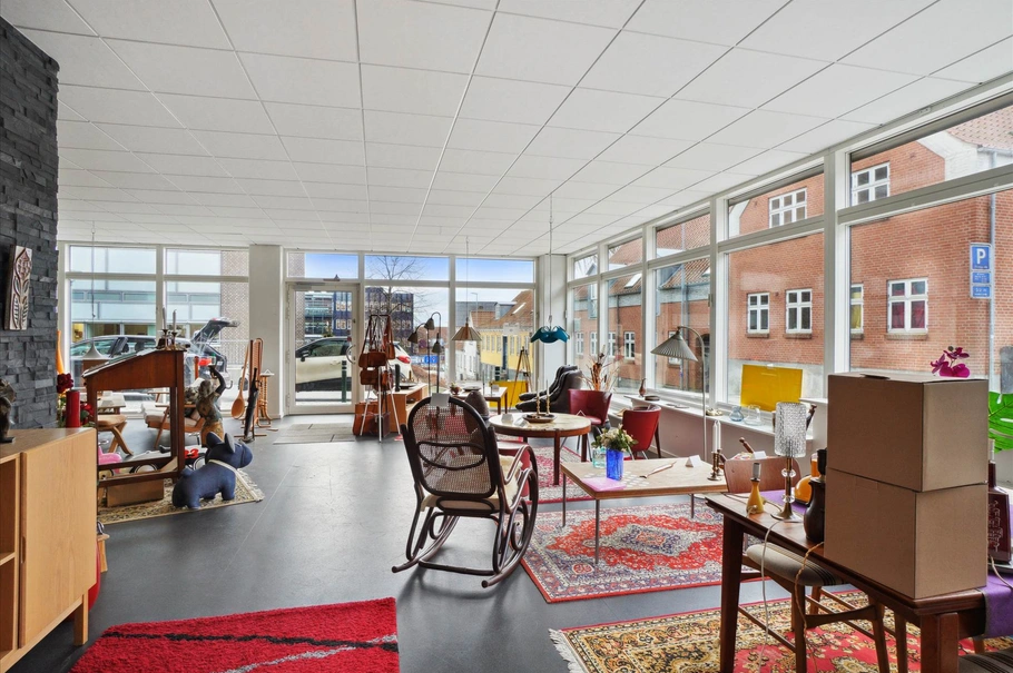 Den lyse og præsentable facade og indgangsparti ligger i stueetagen på moderne lejlighedskompleks opført i 2013, hvor der er en stor konstant kundestrøm til Skive Rådhus og Skive Bibliotek, som er nærmeste naboer. Fra selve butikken er der åben adgang til det næste lyse butikslokale, hvorfra der er adgang til badeværelse/toilet, køkken, og to disponible rum.