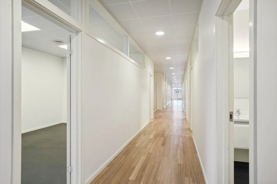 Der er nem adgang til lejemålet enten med trapper eller elevator. Når man træder ind i lejemålet, står man i det rummelige receptionsområde/venteværelse, hvor kundemodtager/receptionist har eget kontor og modtagelse. Lejemålet byder på i alt 6 lyse kontor/klinik-lokaler i varierende størrelse fra ca. 15 m² til ca. 26 m², hvor alle rum er indrettet med egen håndvask. Der er både toilet, badeværelse med toilet/bad, disponibelt ”skyllerum”, og flere depot/teknik-rum.